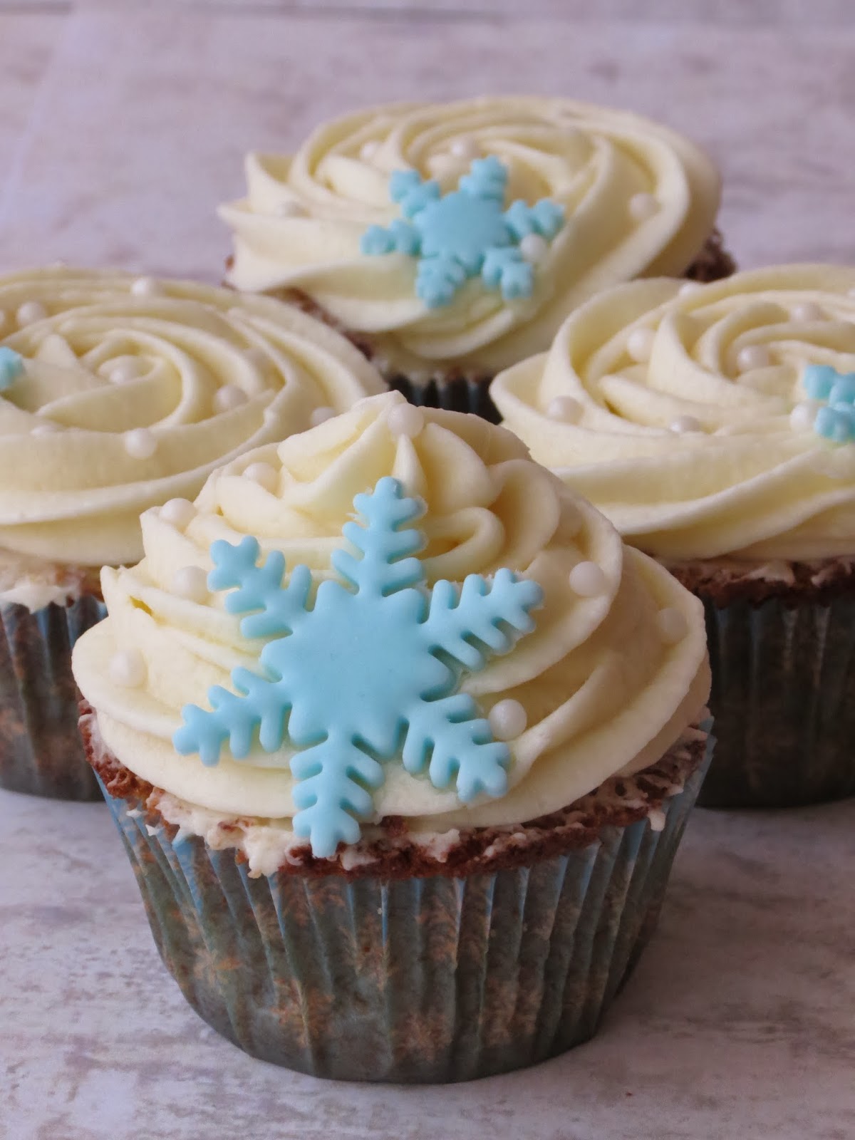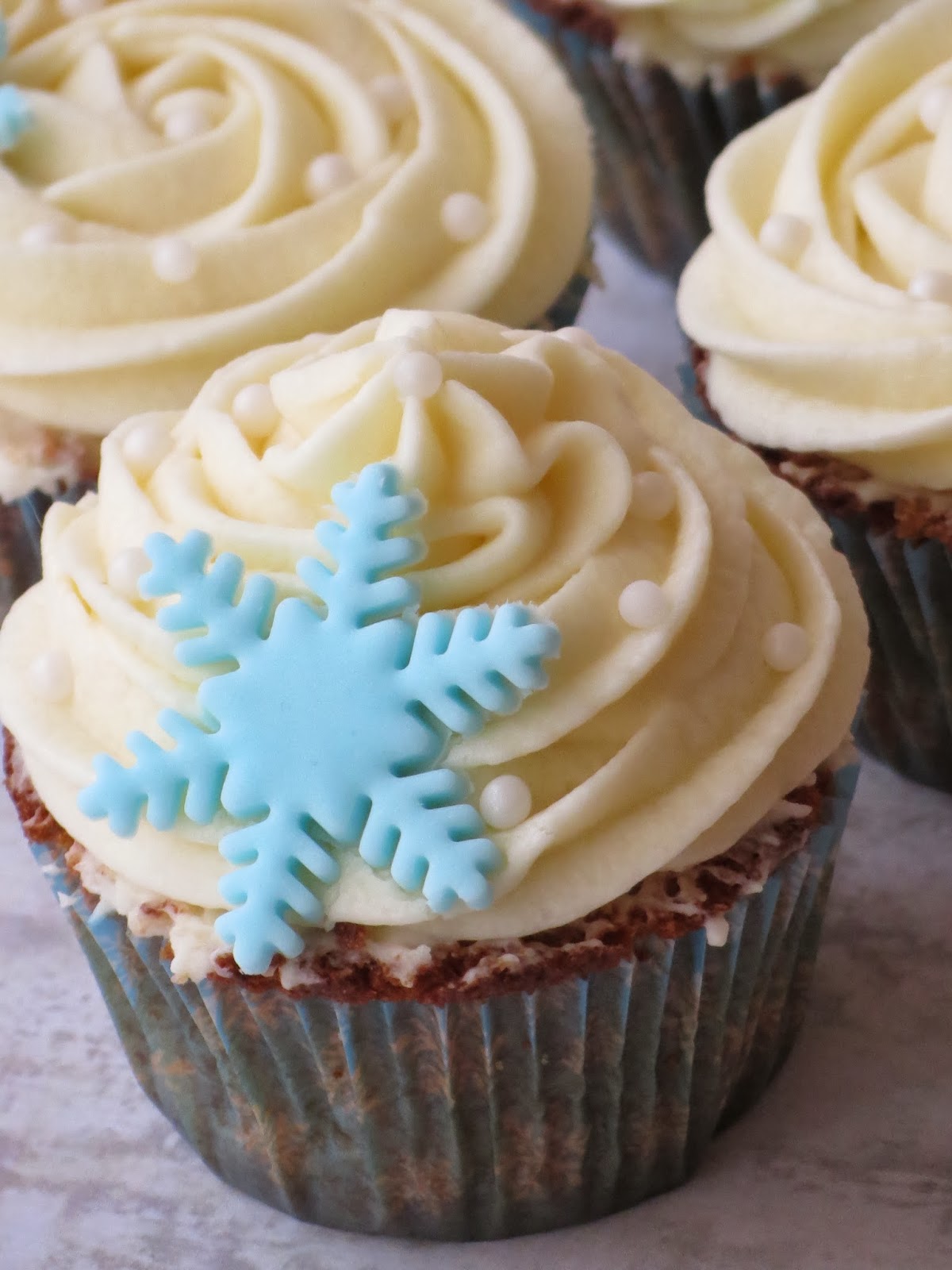 Para el buttercream, batimos la mantequilla a temperatura ambiente junto con el azúcar glas tamizado. Hasta que la masa quede homogénea y blanca. Entonces, añadimos la leche y la vainilla, y seguimos batiendo un par de minutos más. A continuación ponemos la leche condensanda (al gusto) y removemos con una espátula. Después lo introducimos en la manga pastelera y decoramos nuestro cupcake con el buttercream de leche condensada. Los copos de nieve de fondat, los hacemos con unos moldes y los pegamos con pegamento comestible junto con las virutas perla.