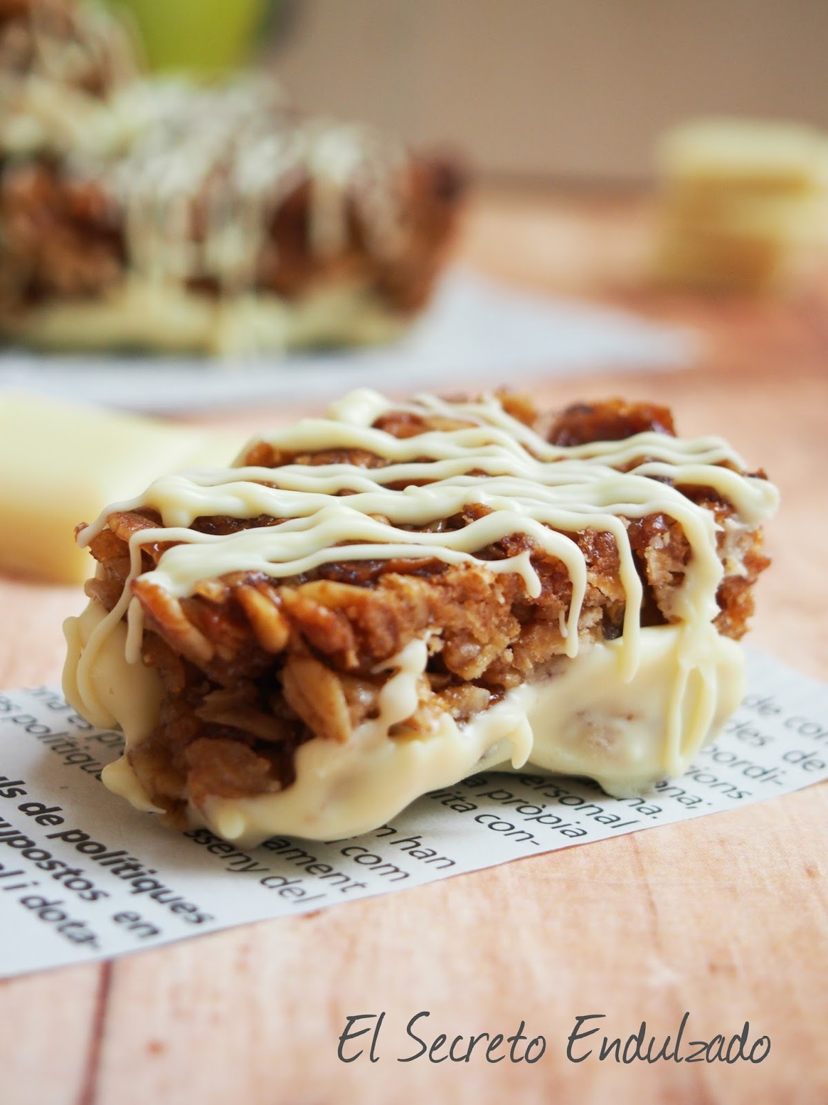 Horneamos durante 20 minutos a 150ºC-180ºC aproximadamente. Y listo! Las tenemos 🙂 Cortamos las barritas a nuestro gusto. Fundimos el chocolate blanco, en el microondas, de 20-30 segundos. A nosotras nos han servido con dos rondas de 30 segundos (cuidado que no se os come, que es muy sensible el chocolate blanco ;)) y lo ponemos por encima a nuestro gusto 😉